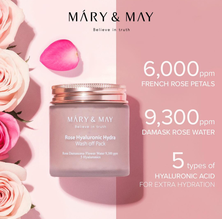 این ماسک شستنی رز هیالورونیک اسید برند مری و می یک محصول مرطوب کننده و آرام بخش برای پوست است. این ماسک شامل ۶۰۰۰ppm گلبرگ رز فرانسوی ، پنج نوع اسید هیالورونیک و ۹۳۰۰ppm آب رز داماسک است که رطوبت را به پوست ارائه میدهد و آن را نرم و صاف میکند. عصاره انجیر در فرمول این ماسک اثر ضد پیری دارد. این ماسک همچنین شامل پانتنول و سرامید NP است که موجب تقویت موانع پوستی می شود. این ماسک وگان و بدون سوء استفاده از حیوانات هیپوآلرژنیک و با استفاده از مواد مصرفی تایید شده توسط EWG تهیه شده است.